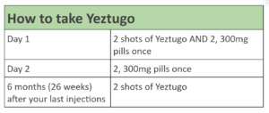 Once in the maintenance phase, you only need 2 shots at the same time every 6 months (26 weeks). When starting this medication, you need to get the 2 shots in addition to oral pills for the first 2 days.